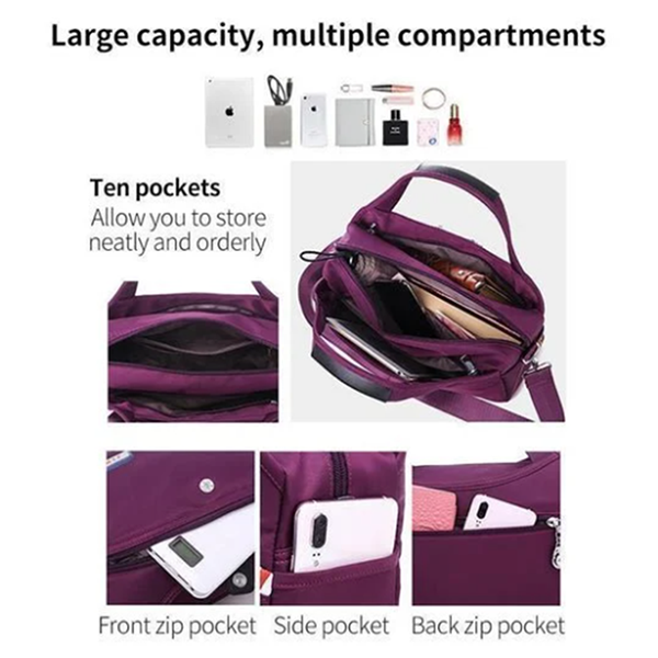 Multifunction: This shoulder bag is casual and multifunctional. It features many multifunction pockets to store essentials such as a mobile phone, purse, pair of glasses, passport, travel documents, keys, and a compact camera.