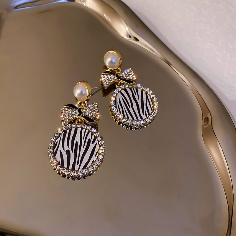 Diamond Pearl Striped Bow Earrings
